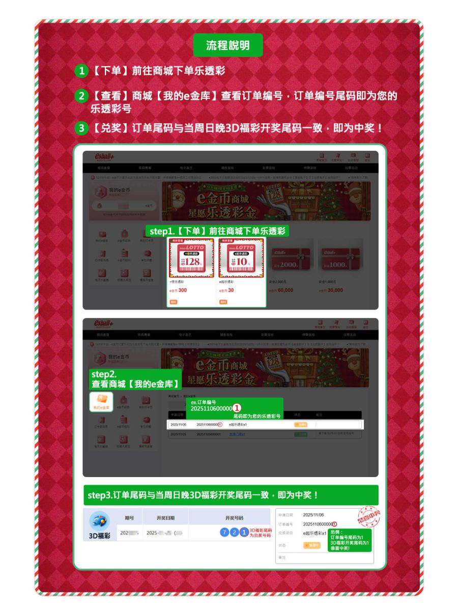 - 活动内容:e金币商城🌟星愿乐透彩🌟限时快闪上架 订单号就是你的幸运号!!活动期间e金币商城北京时间每周一中午12点至周日中午12点上架”星愿乐透彩”并开放兑换,如下单乐透彩的订单编号尾码与当周日开奖的福彩3D开奖尾码一致,即可获得乐透彩金!